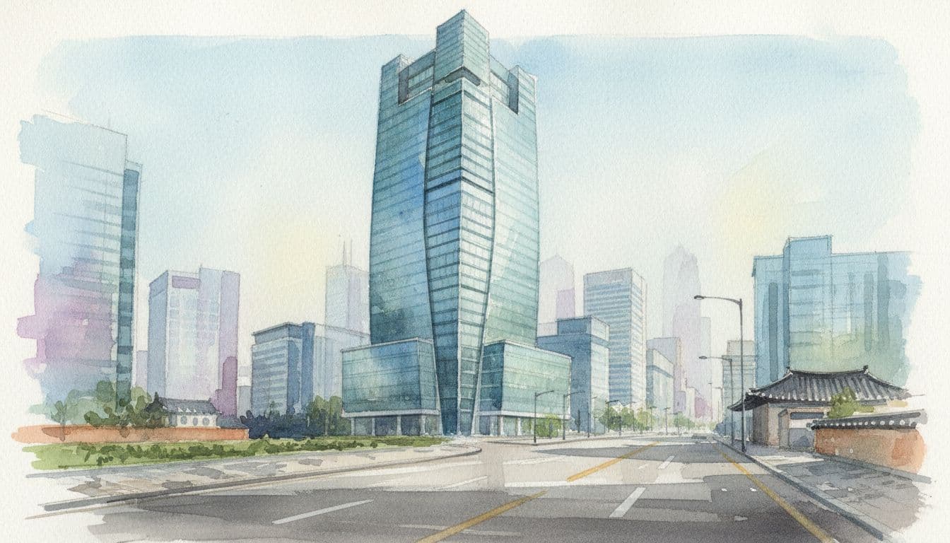 An AI-created illustration of a Seoul finance district headquarters vibe, matching the type of business environment where large brokerages operate.